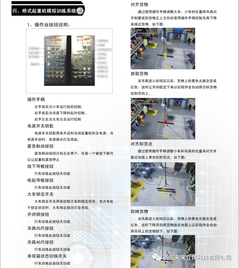 桥式天车起重机模拟器是一项高技术产品,融合了起重机动力学、起重机运动学、数字图像处理、计算机图形学、传感与控制技术、信息技术、现代起重机操作技术、安全操作规范等多项学科的技术内容,代表了现代职业教育的发展方向,是一种绿色环保、无碳排放、低成本的现代化起重机操作训练及考核的先进技术。港口起重机综合模拟系统能提供一个基于虚拟现实原理合成的虚拟工作环境的全三维图形显示。在模拟系统中,起重机操作员将坐在一个由真实、互动的世界全面围绕的驾驶室内。起重机模拟系统结合了可视化信息与声频技术,能对真实的工作环境进行了十分逼真的模拟。